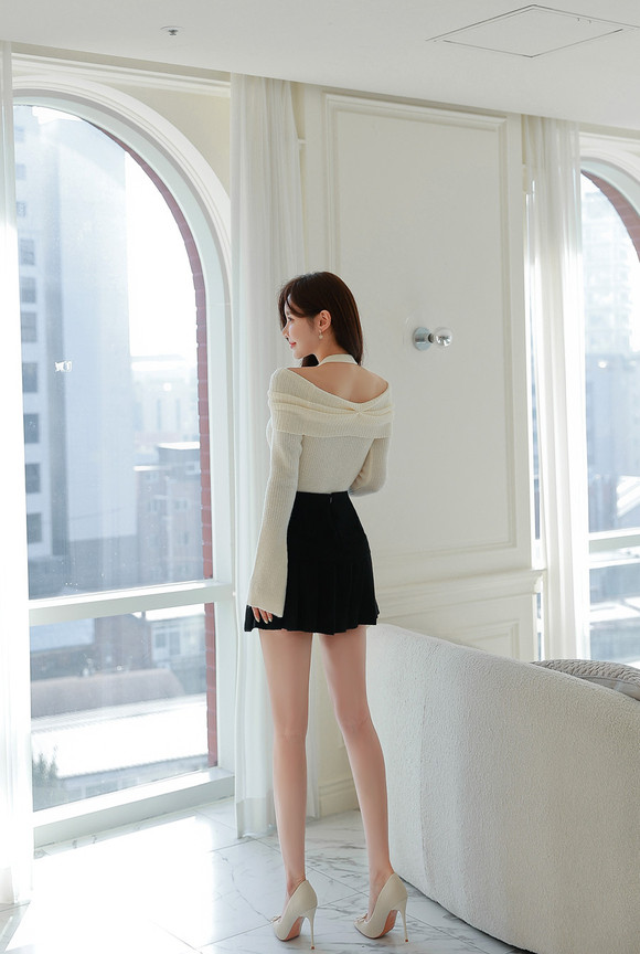 米色露肩上衣搭配黑色高腰短裙,经典黑白配色展现简约时尚。露肩设计巧妙展示柔美肩线,A字裙型修饰腰身,凸显修长美腿。裸色高跟鞋完美收尾,整体造型优雅而不失活力,彰显现代女性独特魅力。